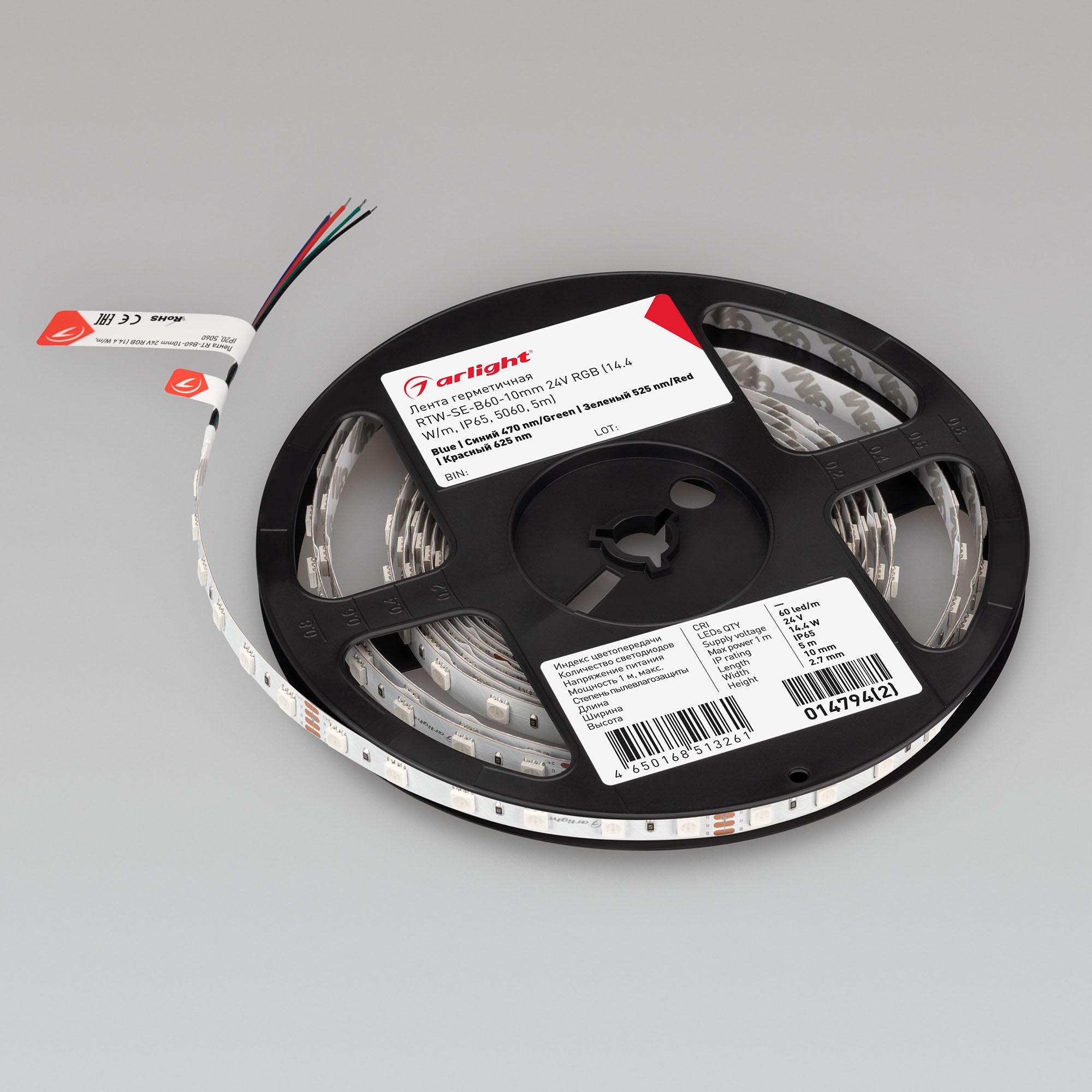 Светодиодная лента RTW-SE-B60, герметичная IP65 (SE-силиконовый верхний слой). Светодиоды 5060, 60 шт/м (300 шт на 5 м), белая плата, ширина 10 мм, скотч 3M. Цвет RGB, угол 120°. Питание 24V, мощность 14.4 Вт/м (72 Вт на 5 м). Размеры 5000x10x2.7 мм. Мин.отрезок 100 мм, 6 светодиодов. Декоративная мультицветная подсветка ниш, элементов декора. Подсветка рекламных конструкций и витрин. Световые линии с изменяемым цветом свечения. Оформление клубов, залов, ресторанов.
