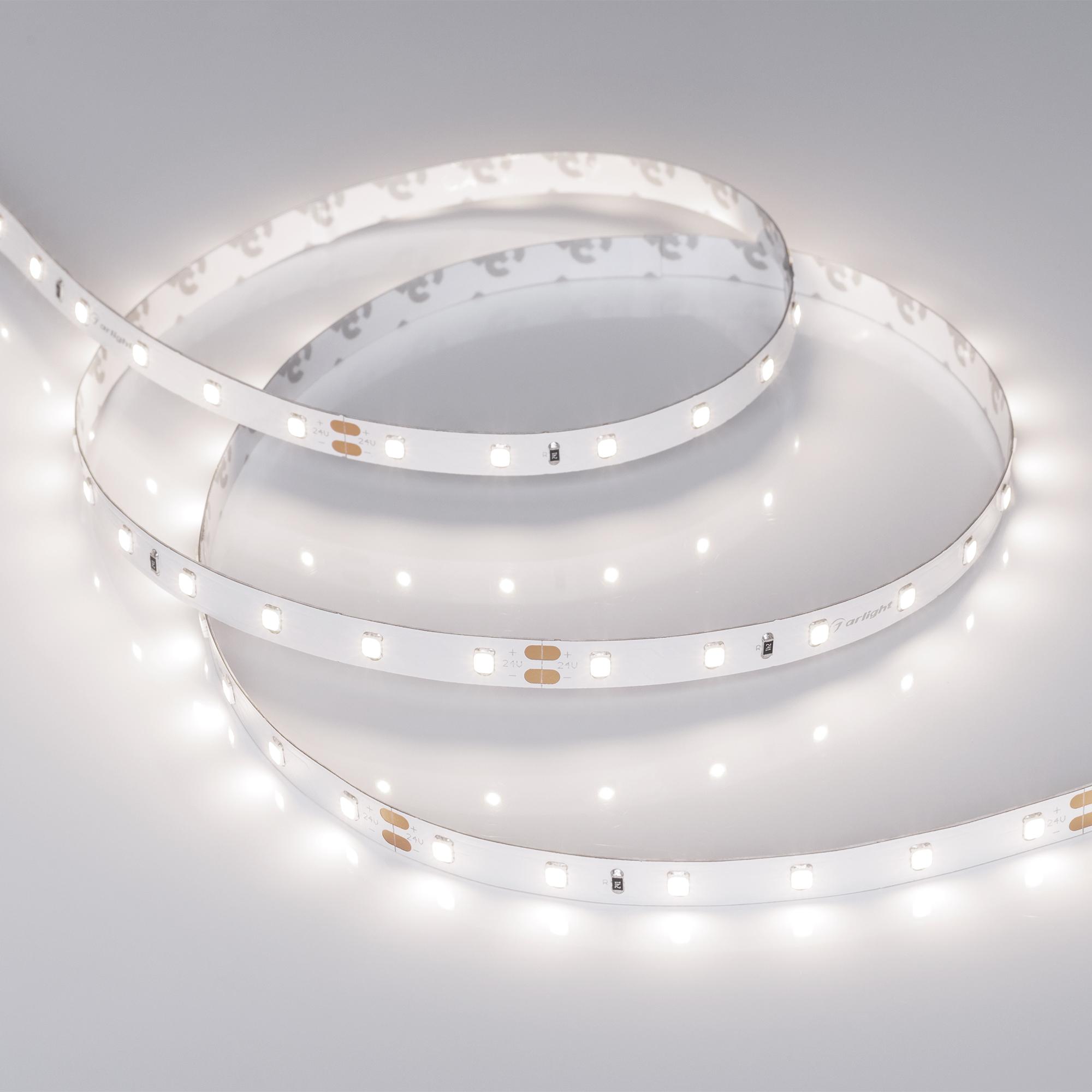 Светодиодная лента RT-A60, открытая. Светодиоды 2835, 60 шт/м (300 шт на 5 м), белая плата, ширина 8 мм, скотч 3M. Цвет ДНЕВНОЙ 4000 K, цветопередача CRI 95..98, угол 120°. Питание 24V, мощность 4.8 Вт/м (24 Вт на 5 м). Размеры 5000x8x1.8 мм. Мин. отрезок 100 мм, 6 светодиодов. Декоративная подсветка интерьера, потолочных ниш. Подсветка рекламных конструкций и витрин. Подсветка рабочих зон кухни, мебели. CRI98 - высокая цветопередача.