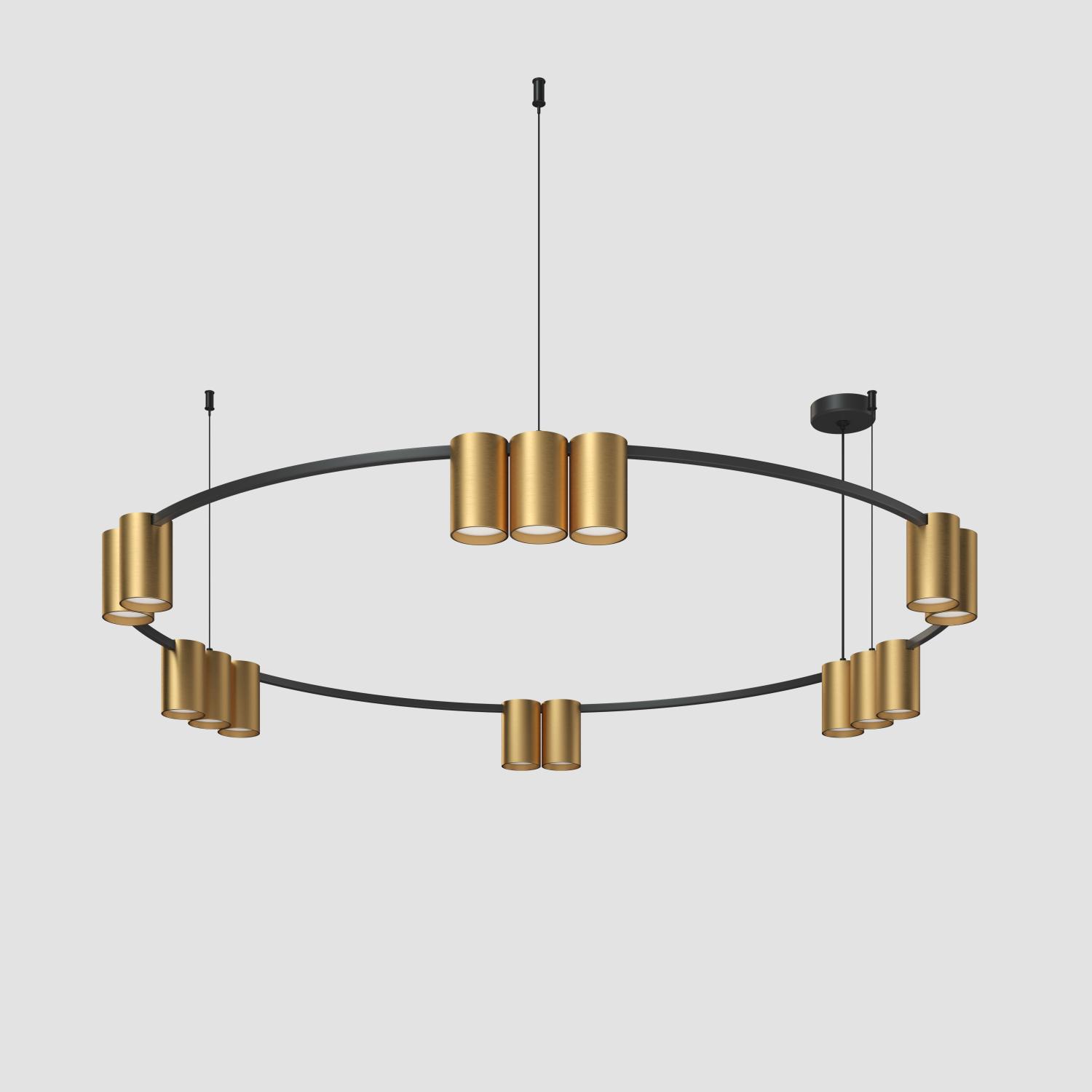 ORBIT подвесной светильник. Диаметр 1 м. Возможна регулировка по высоте. Корпус изготовлен из алюминия, эффективно отводящего тепло, и имеет матовую шероховатую поверхность. 15 плафонов под сменную лампу. Модель представлена также в цвете черный матовый.