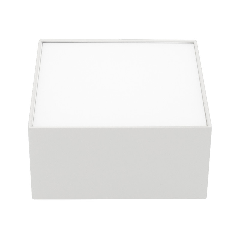 Накладной светильник. Мощность 13 Вт, св. поток 1140 лм, 80-90 лм/Вт, теплый 3000 K, CRI>90, угол 120°, напряжение питания 230 В. Белый квадратный корпус из алюминия, экран PC, степень защиты IP40. Размер: длина 120 мм, ширина 120 мм, высота 59 мм. Монтаж накладной. Драйвер 20-40 В, 300 мА, пульсация <5%.