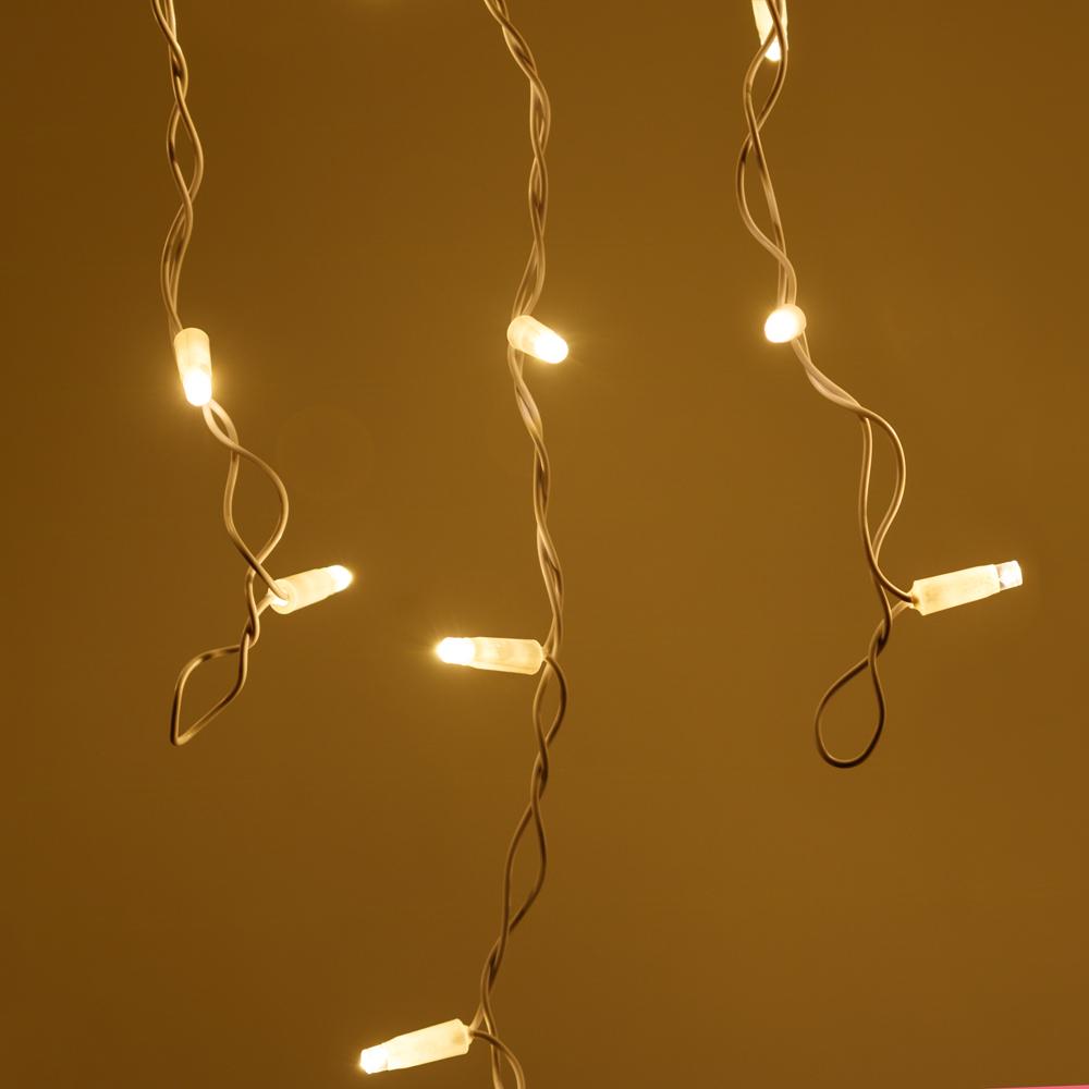 Светодиодная гирлянда \"Бахрома\" серии PRO. Размер 4000x600 (длина 4000 мм, максимальная высота 600 мм). Цвет светодиодов ТЁПЛЫЙ БЕЛЫЙ (3000К), постоянное свечение. Материал провода - белый РЕЗИНОВЫЙ (каучук). Диаметр провода 3.3 мм. 32 нити длиной от 200 до 600 мм, ниспадающих вниз. Количество светодиодов 128 шт. Размер светодиодов 5 мм с защитным колпачком и вогнутой внутрь линзой. Напряжение питания DC 230V, потребляемая мощность 8W. Степень защиты от воздействия окружающей среды IP65. Температурный режим работы от -40 градусов до +40 градусов по Цельсию. Предусмотрена возможность соединения 50 метров между собой без дополнительных аксессуаров. Для подключения одной гирлянды или нескольких гирлянд к сети необходимо приобрести провод питания с выпрямителем AC/DC.