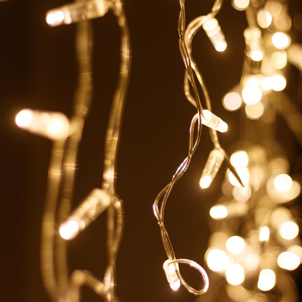 Светодиодная гирлянда \"Бахрома\" серии Classic. Размер 2400x600 (длина 2400 мм, максимальная высота 600 мм). Цвет светодиодов ТЁПЛЫЙ БЕЛЫЙ (3000К), постоянное свечение. Материал провода - прозрачный ПВХ. Диаметр провода 2.3 мм. 24 нити длиной от 200 до 600 мм, ниспадающих вниз. Количество светодиодов 88 шт. Размер светодиодов 7 мм с выпуклым защитным колпачком молочно-белого цвета. Напряжение питания DC 230V, потребляемая мощность 6W, IP65. Для подключения одной гирлянды или нескольких гирлянд к сети необходимо приобрести провод питания с выпрямителем AC/DC. Универсальная светодиодная гирлянда \"БАХРОМА\" серии Classic, предназначенная для декорирования и создания праздничного настроения как внутри помещений, так и снаружи (при соблюдении условий монтажа). Благодаря наличию универсальных соединительных разъемов, имеется возможность нарастить длину до 50 метров без дополнительных аксессуаров. Подобная функциональность позволяет реализовать проект декоративного освещения практически любого масштаба.