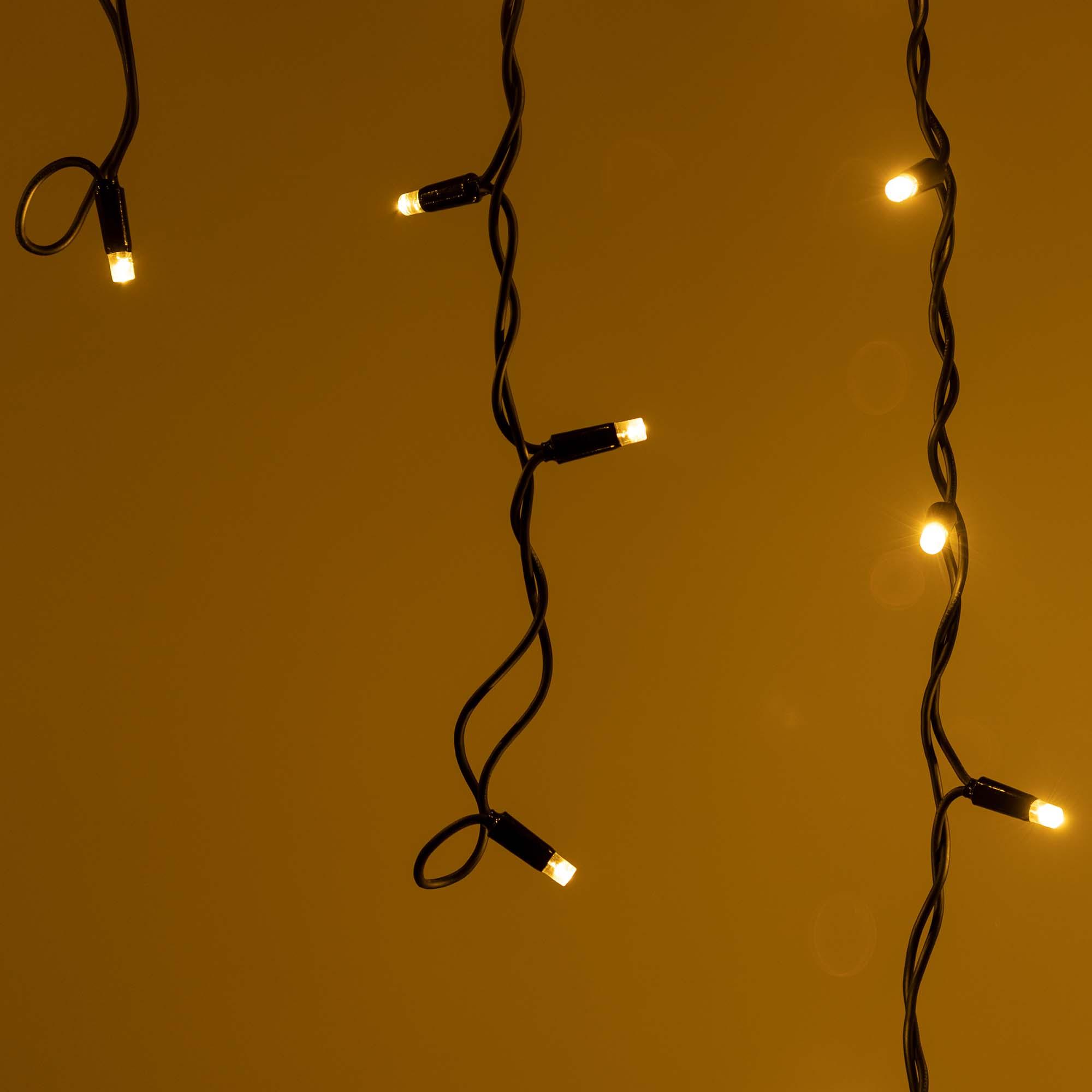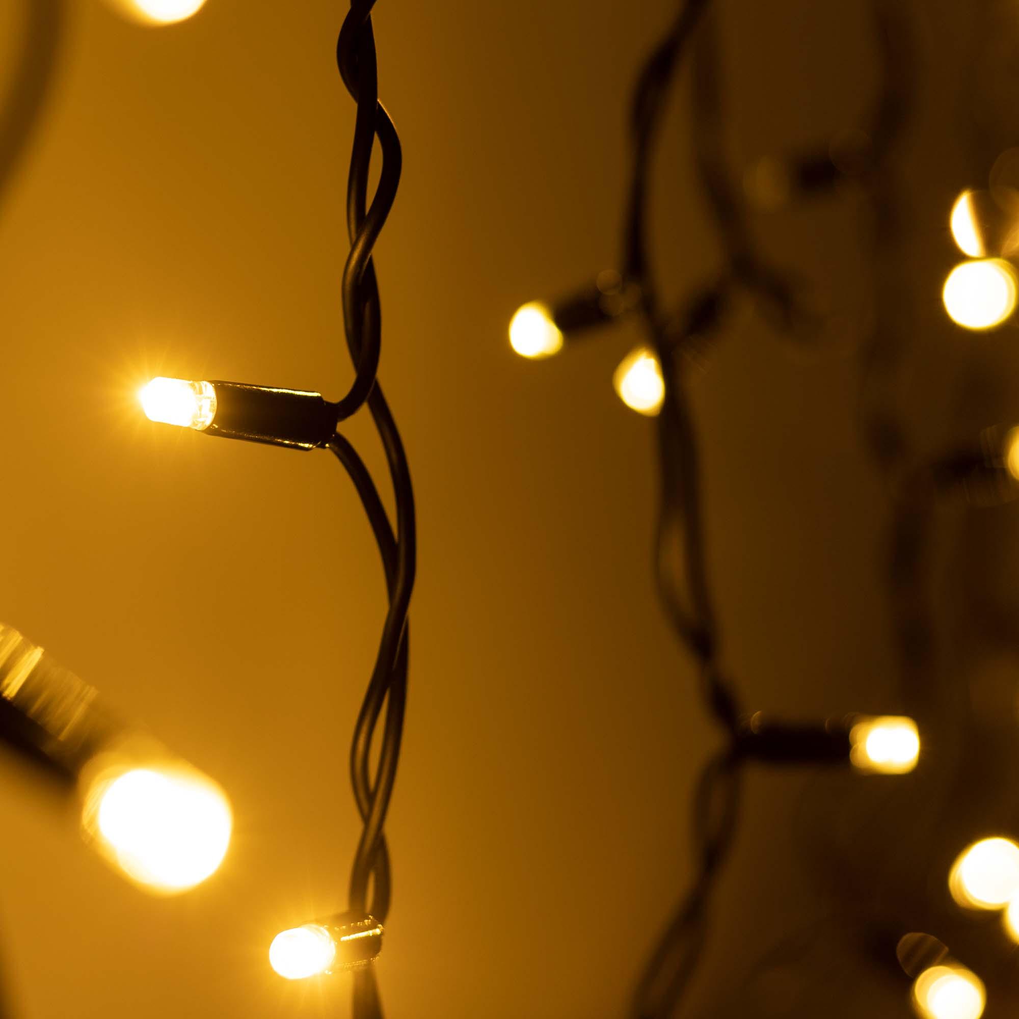Светодиодная гирлянда \"Бахрома\" серии PRO. Размер 4000x600 (длина 4000 мм, максимальная высота 600 мм). Цвет светодиодов ТЁПЛЫЙ БЕЛЫЙ (3000К). Эффект мерцания (Тёплый Белый цвет 3000К). 180-200 вспышек в минуту. Материал провода - чёрный РЕЗИНОВЫЙ (каучук). Диаметр провода 3.3 мм. 32 нити длиной от 200 до 600 мм, ниспадающих вниз. Количество светодиодов 128 шт. Размер светодиодов 5 мм с защитным колпачком и вогнутой внутрь линзой. Напряжение питания DC 230V, потребляемая мощность 8W, IP65. Для подключения одной гирлянды или нескольких гирлянд к сети необходимо приобрести провод питания с выпрямителем AC/DC. Универсальная светодиодная гирлянда \"БАХРОМА\" серии PRO, предназначенная для реализации уличных проектов освещения с низкими температурами окружающей среды. Благодаря наличию универсальных соединительных разъемов, имеется возможность нарастить длину до 50 метров без дополнительных аксессуаров. Подобная функциональность позволяет реализовать проект декоративного освещения практически любого масштаба.