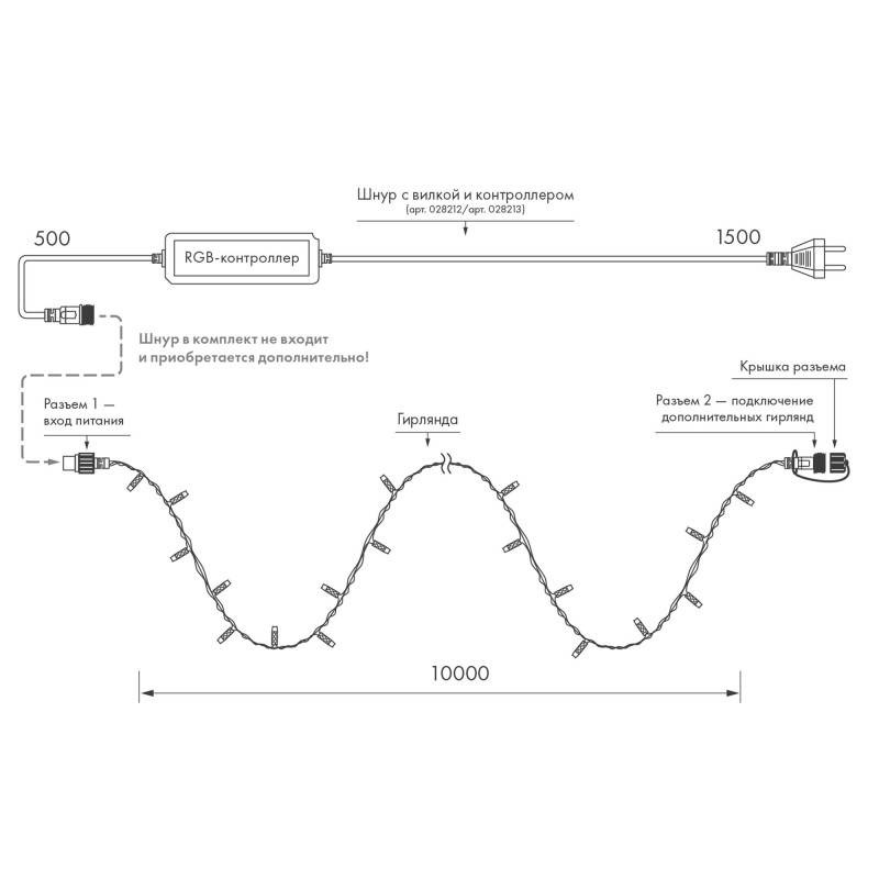 Светодиодная гирлянда \"НИТЬ\" серии Classic. Длина 10000 мм. Цвет светодиодов RGBW. Материал провода - чёрный ПВХ. Диаметр провода 2.3 мм. Количество светодиодов 95 шт. Режим динамических эффектов, управление по протоколу DMX512. Размер светодиодов 7 мм с защитным прозрачным колпачком и вогнутой внутрь линзой, расстояние между светодиодами 100 мм. Напряжение питания DC 24V, потребляемая мощность 10W. Степень защиты от воздействия окружающей среды IP65. Для подключения необходим контроллер и DMX-декодер (см. совместимые). Актуальная схема подключения в паспорте изделия.
